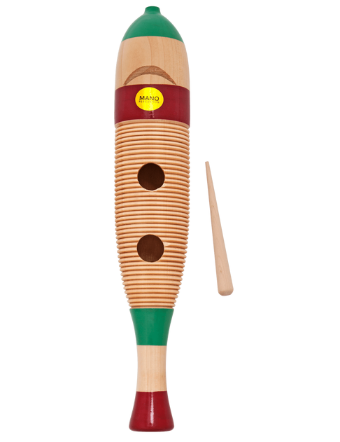 Large wooden guiro. 16" long, 3" diameter. Fish shaped cylindrical tapered shell with red, natural and green coloured ends. 7" ribbed playing area with two finger holes. Complete with wooden scraper.