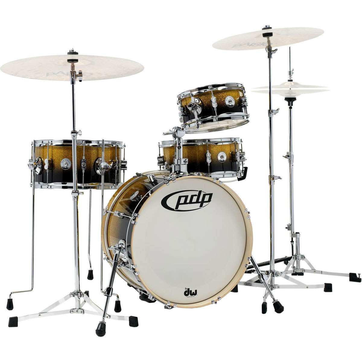 Gig-friendly, highly-portable and fun to play, PDP’s 4-piece Daru Jones New Yorker Drum Kit comes complete with DW 6000 Series Ultralight Hardware and nylon bags for everything! The DJNY rig combines hybrid poplar/maple shells with “short stack” drum dimensions for a kit that sounds remarkably big and warm for its diminutive size. And its striking appearance comes courtesy of a large-flake, Gold-to-Black Sparkle Fade lacquer finish.